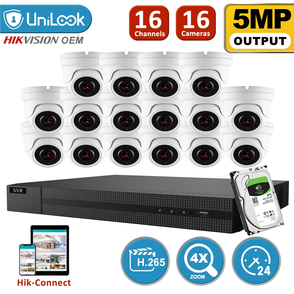UniLook 16CH NVR 16Pcs 5MP White Dome POE IP Camera NVR Kit Security System 2.8-12mm 4X Zoom IR 30m NVR Kit P2P View Onvif H.265